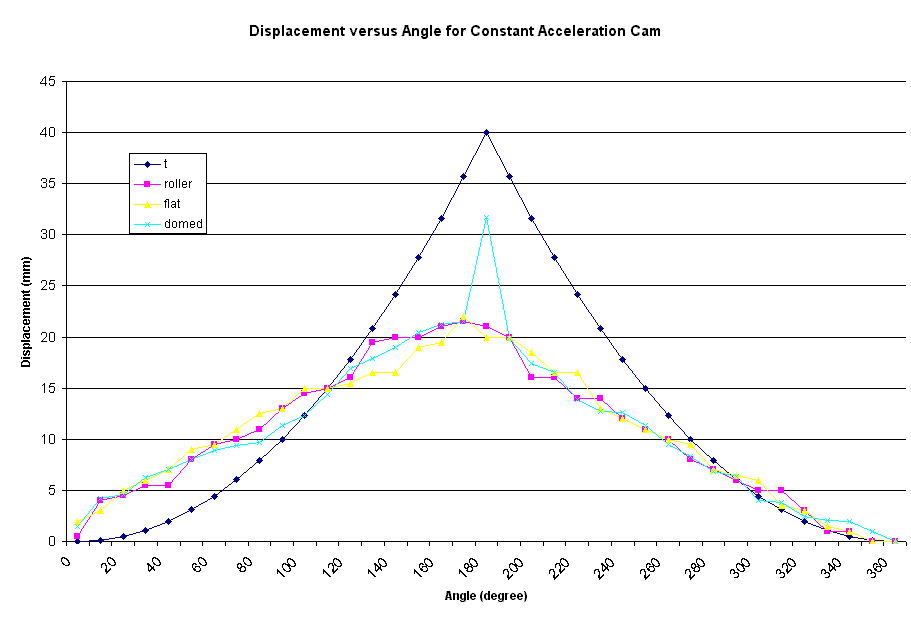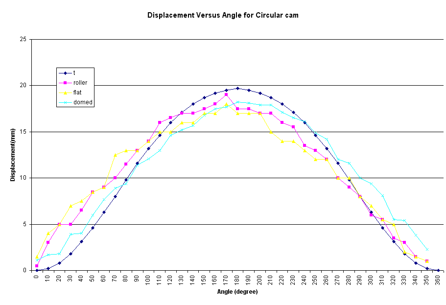 From the data collected, five graphs were plotted each representing all the cams used in the experiment with different types of followers which were the roller, flat and domed. From the graphs, although each of the plotting were quite similar with one another in terms of the followers used but it does exhibit a different effect. It seems that the roller gave a more stable reading or measurement than the other two followers. Apart from that, nothing significant could be observed except for an obvious relative differences with the theoretical plotting.