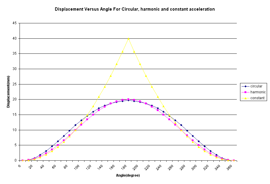 The three plotting of displacement versus angle for the constant acceleration, harmonic and circular show that they have a similar shape but posses an entirely different slopes which exactly show the characteristics of their motion. The constant acceleration plotting has the steepest slope with a uniform increase and decrease from 0 to 360o followed by the circular and harmonic cam. Although the parabolic shaped cam which refers to the circular cam and hamonic cam seems to show no difference except for the slope, they actually different in its motion. The circular cam actually has a higher acceleration than the harmonic cam. The circular cam velocity’s increases and decreases very rapidly and uniformly but the harmonic cam velocity’s increases and decreases slowly but achieve the highest velocity compared to circular cam.